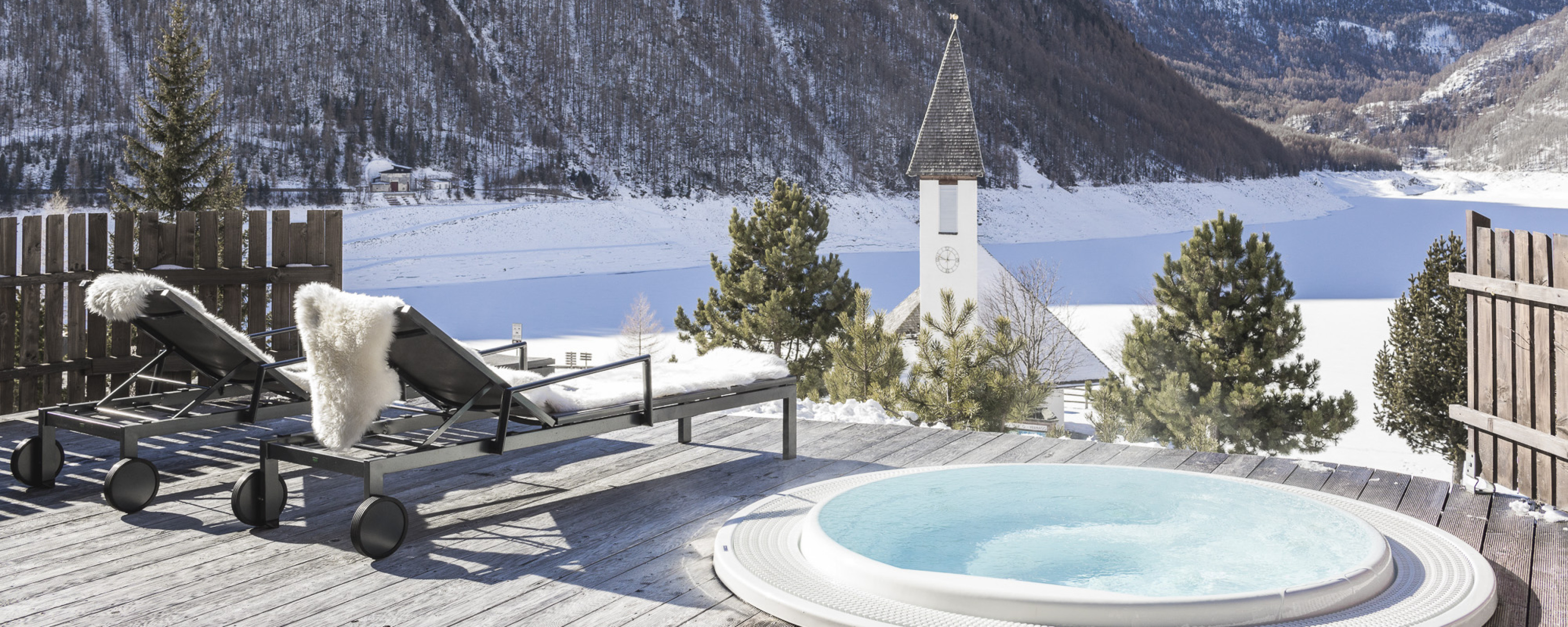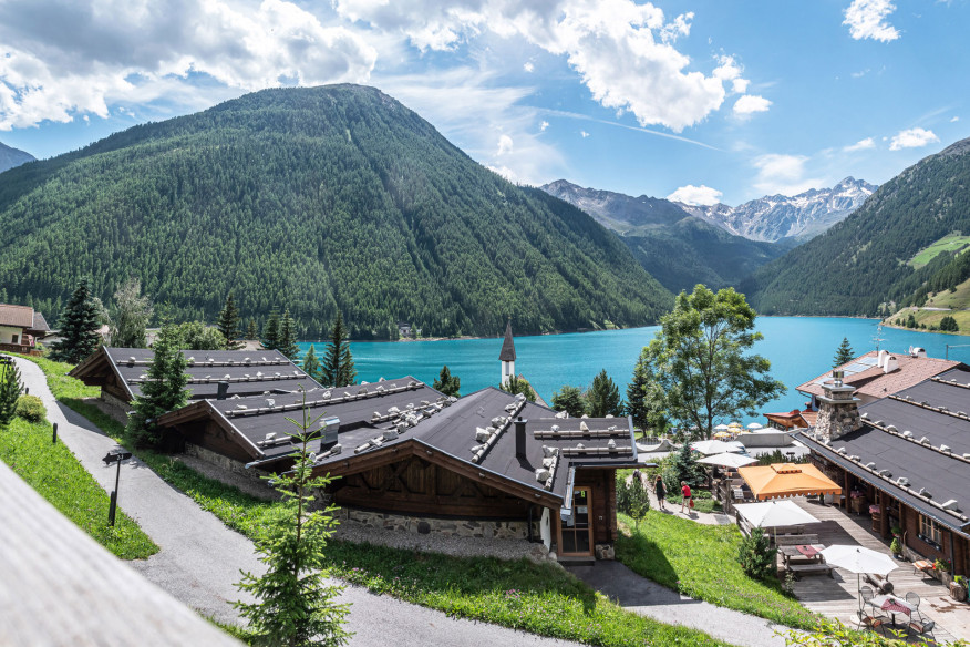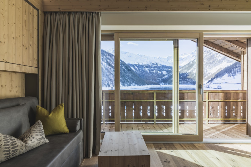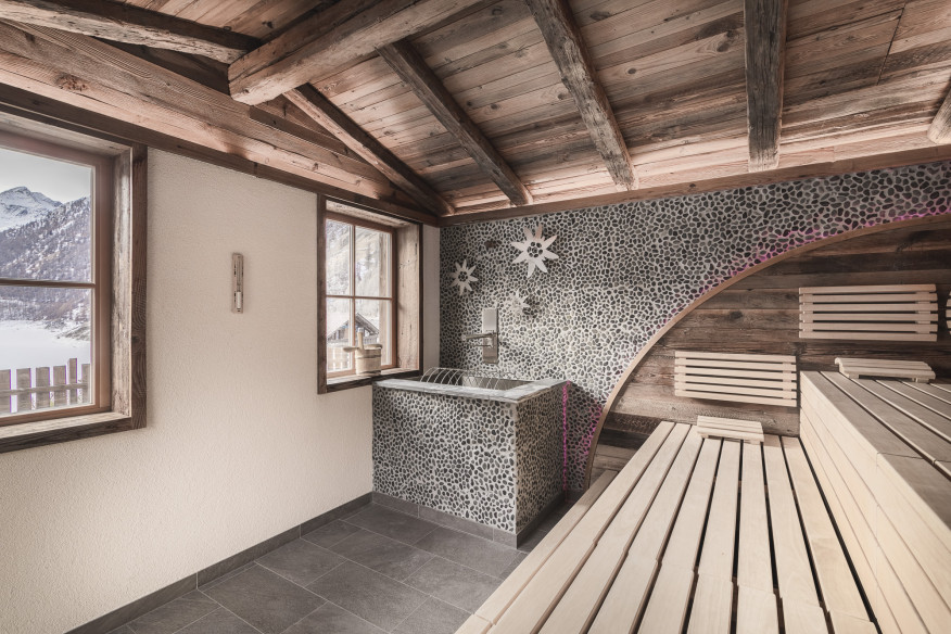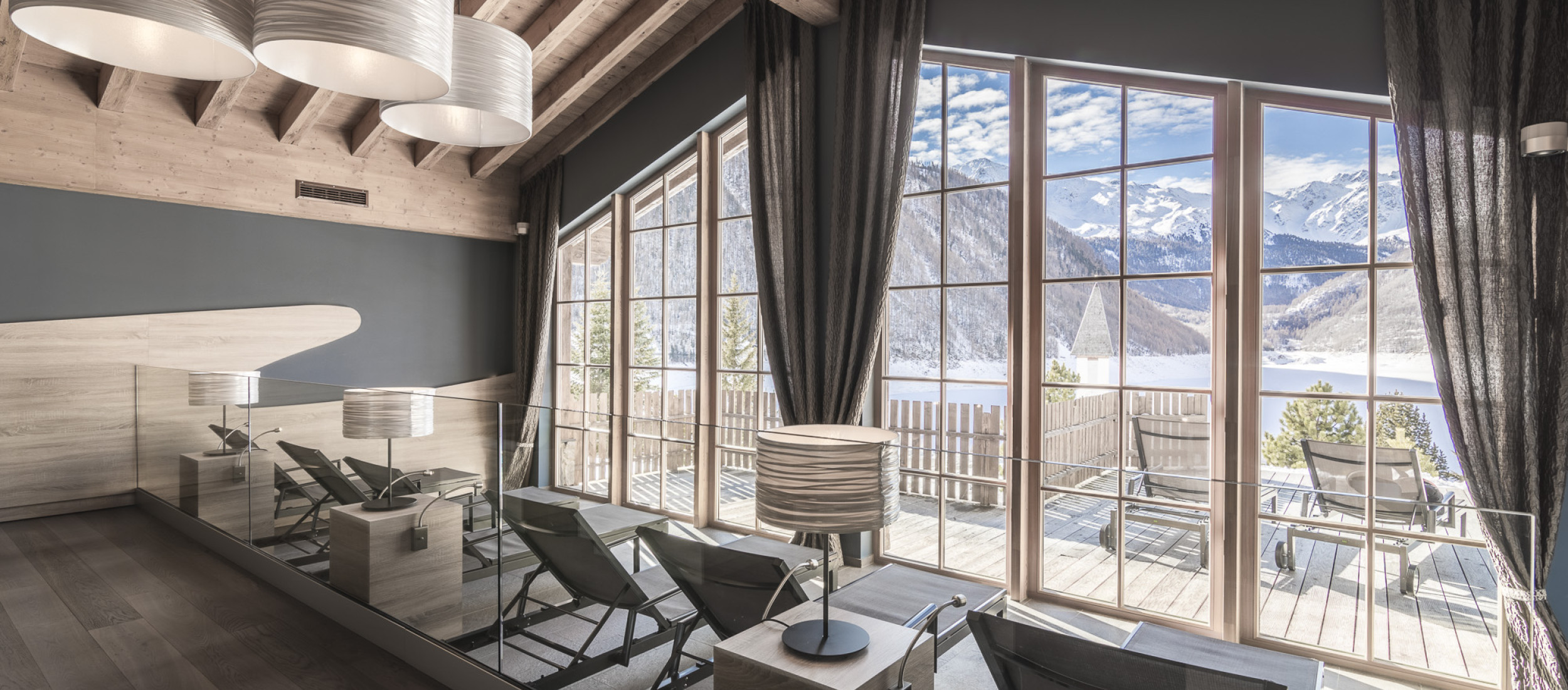Unser Ruheraum ist mehr als ein Ruheraum. Er ist Auszeit vom Alltag, ein Ort zum Runterkommen und Naturkino zugleich. Die Panoramafenster eröffnen einen freien Blick auf den See und die Schnalser Berge. Hier heißt es: sich ein paar Minuten auf eine Liege legen, den Kopf auf Leerlauf schalten und einfach mal nichts tun.